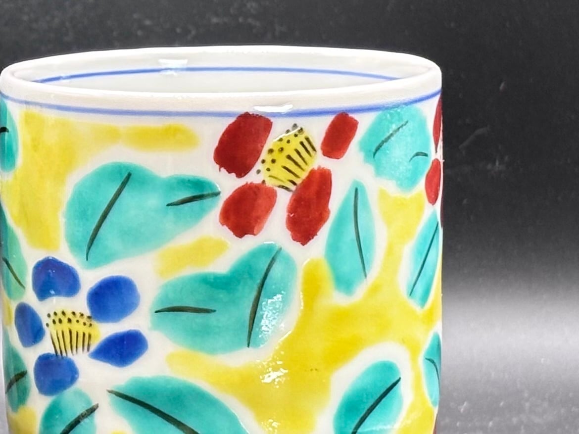 華やかな花文様の九谷焼花文組湯呑